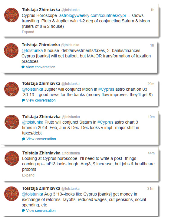 There are various transits coming up to the astro chart of Cyprus (http://www.astrologyweekly.com/countries/cyprus.php). To capture it all more coherently & provide more in-depth interpretations, I plan on writing a separate post. For now, just wanted to re-post my tweets, to keep the info in one place and reach a different audience: