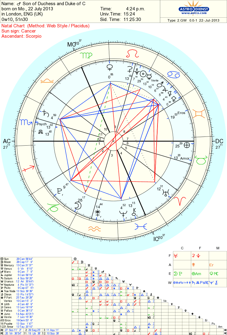 The boy was born on July 22, 2013 at 4:24 p.m. local time at a hospital in London. Here’s the royal baby’s astrological chart: