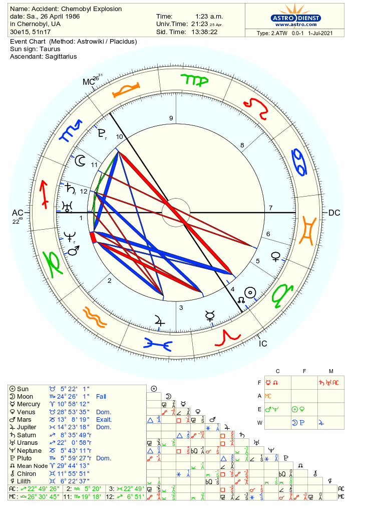 During major events, such as a large earthquake or a large-scale industrial disaster, the event charts often have slow-moving planets (e.g., Saturn or Pluto) on one of the axis of the chart (e.g., Ascendant or IC). For instance, Uranus was rising in the Chernobyl Explosion chart [to clarify, this is not one of the events in the video, am just mentioning it as an example of a slow planet on an axis on an accident chart].